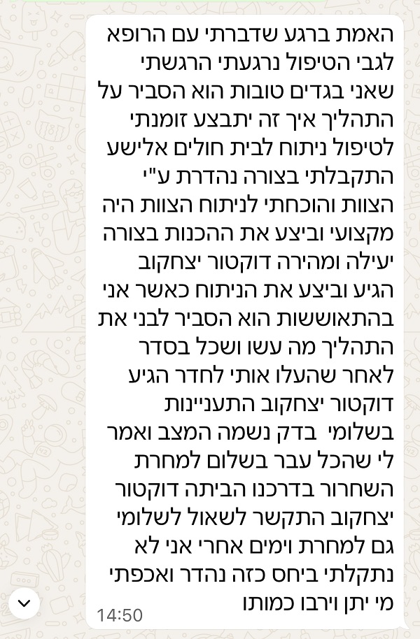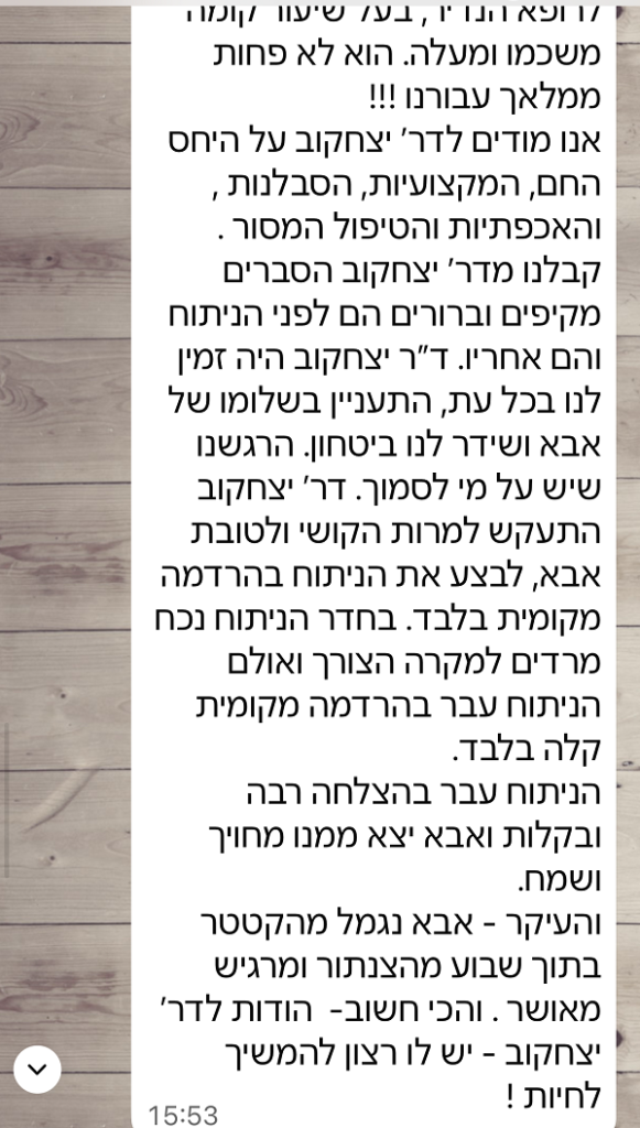 כל תהליך ההתייעצות הרגיש נפלא ומובן, ביום הניתוח הגעתי לבית חולים רפאל שם דאגו לי וטיפלו בי ברמה הכי גבוהה.