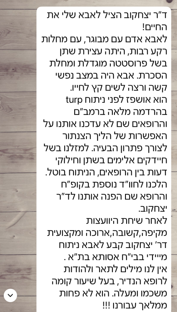 תודתי העמוקה לרופא המבצע ד"ר זלמן יצחקוב, ולחברי ומכרי אני מציע לבדוק טיפול זה במידת הצורך.