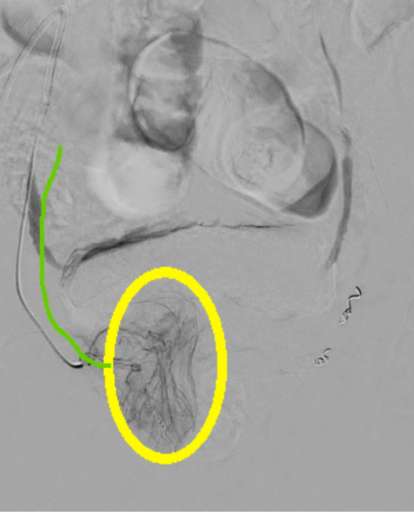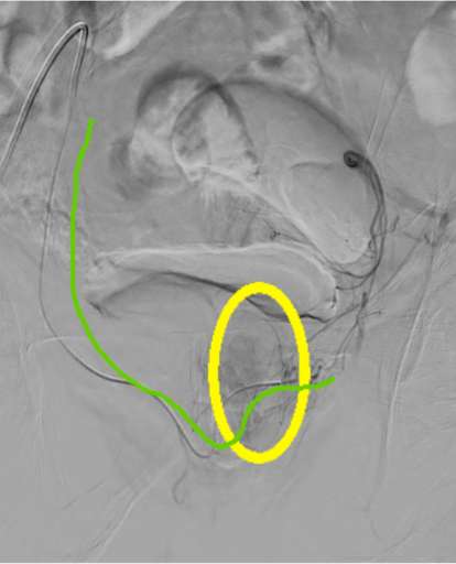 אפשר לראות את המעקף (מסומן בצבע אדום) המוביל דם לערמונית מימין ובהמשכו באמצעות מעקף לעורק הערמונית השמאלי (מסומן בסגול). גבולות הערמונית מסומנות בצהוב. מיקרוקטטר בירוק.